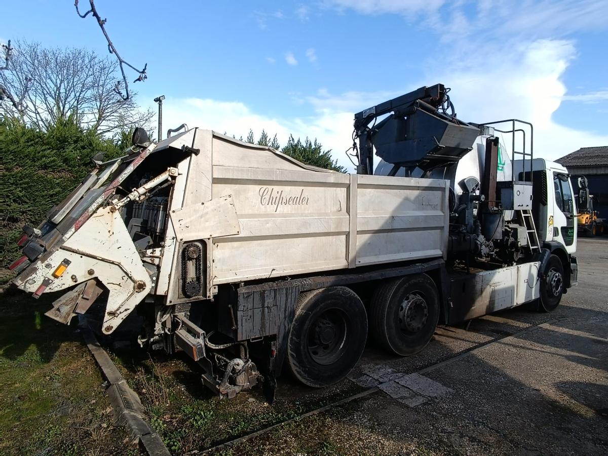 Truck Renault Premium 6×2 Capacity: 3500L Chipsealer tipper Crane + Grab bucket for loading Automatic system + manual spreading